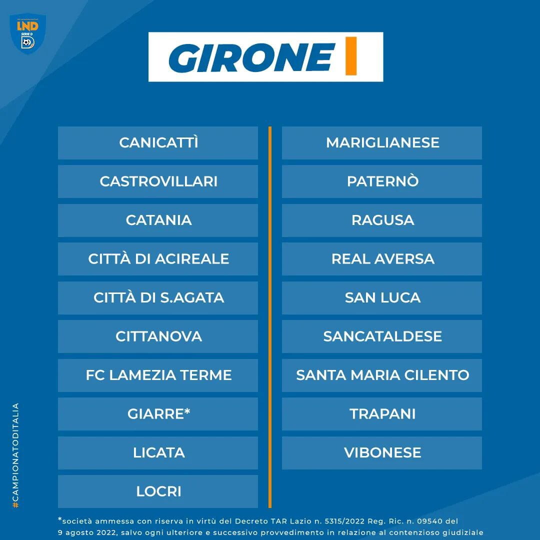 Questa la composizione del girone I: Canicattì, Castrovillari, Catania, Città di Acireale, Città di S.Agata, Cittanova, Trapani, FC Lamezia Terme, Licata, Locri, Paternò, Santa Maria Cilento, Ragusa, Real Aversa, San Luca, Sancataldese, Marignlianese, Vibonese e appunto Giarre, ammessa con riserva in virtù del Decreto TAR Lazio n. 5315/2022 - Reg. Ric. n. 09540 del 9 agosto 2022, salvo ogni ulteriore e successivo provvedimento in relazione al contenzioso giudiziale.