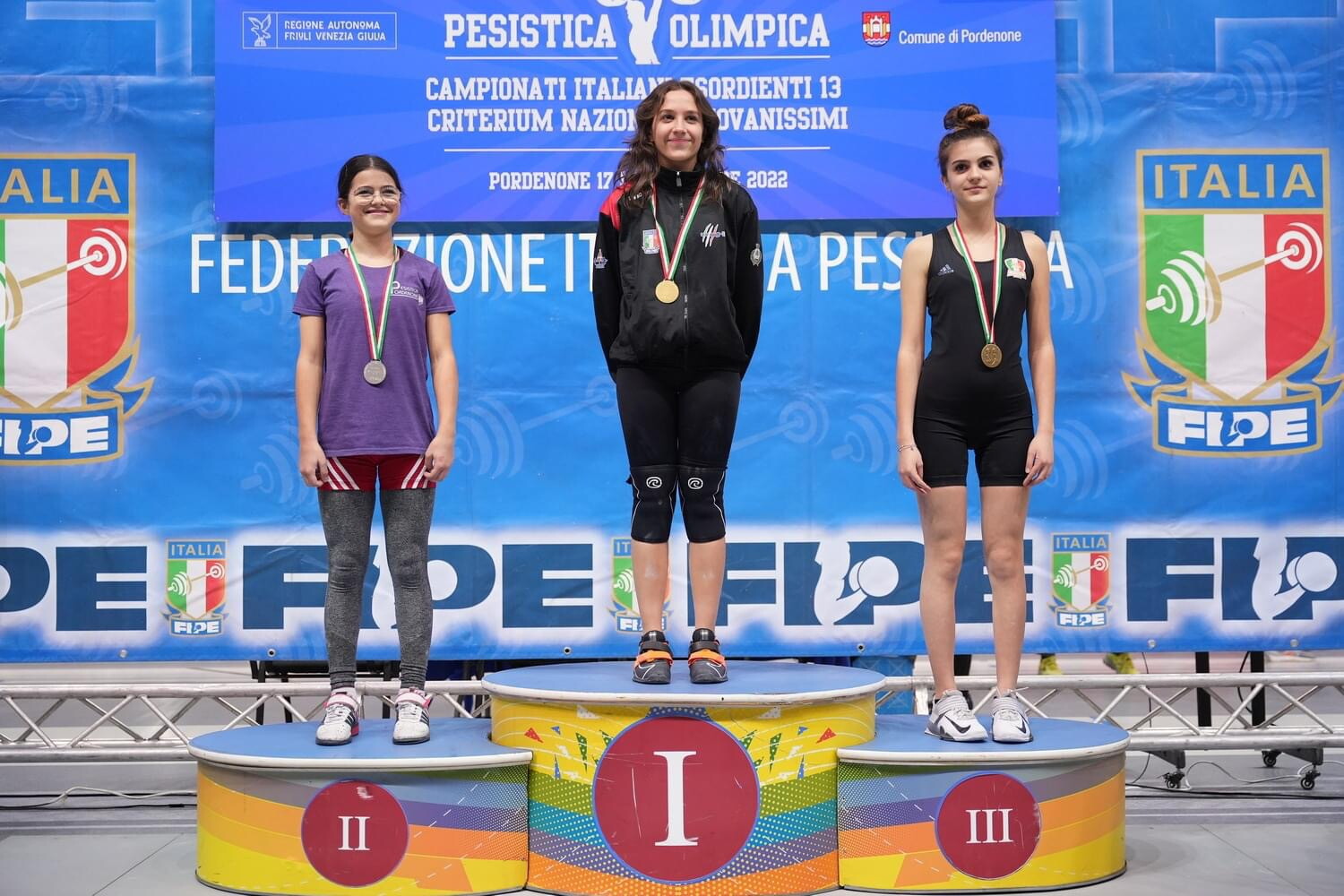 Un bronzo nella categoria esordienti grazie alla peloritana Serena Puliafito (Pesistica Milazzo), terza nella finale dei 45 kg con 25 kg nello strappo, 35 nello slancio e il totale di 60 kg. Nella finale dei 55 kg, sesto posto per la sua compagna di squadra Francis Marie Puglisi, con 25 kg nello strappo, 37 kg nello slancio e il totale di 62 kg.