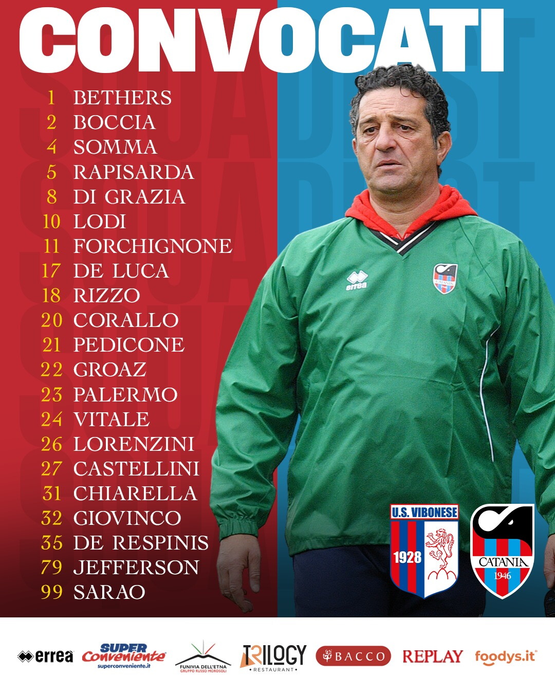 Tra i 21 convocati non figurano tanti nomi di attaccanti: era certa l’assenza di Sarno, infortunato. Si immaginava anche quella di Litteri che il tecnico Ferraro vuole recuperare appieno (“ha bisogno di lavorare con calma, senza il pericolo di ricadute”), ma si pensava che Andrea Russotto potesse recuperare. Russotto non è nella lista dei giocatori che sono già in Calabria per vivere la vigilia del match in casa della Vibonese (domani alle 14,30). Ha recuperato Jefferson anche se non è al meglio della condizione e potrebbe comunque accomodarsi in panchina. Dopo la rifinitura, dunque, lo stesso Ferraro ha convocato il giovane Clarence Corallo, attaccante della Juniores: il giovane catanese, classe 2005, indosserà la maglia numero 20 e potrebbe anche andare in panca. C’è il nuovo acquisto De Respinis, che ha esordito contro il Licata, così come il baby Forchignone, ormai pienamente ristabilitosi.