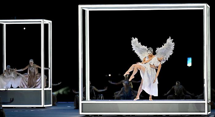 3. I danzatori dell’Accademia del Teatro alla Scala che mimano i gesti degli sport invernali attorno ai Canova sovradimensionati, con Amore e Psiche come emblema di una unione che attraversa il tempo.