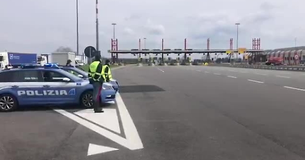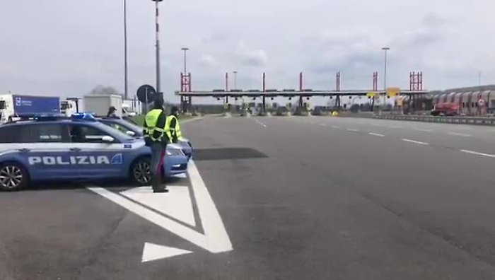 Il saluto della Polizia Stradale alla barriera di Mestre delle salme in viaggio da Bergamo al crematorio di Cervignano del Friuli. I feretri sono a bordo di mezzi militari. Un video diventato virale in rete