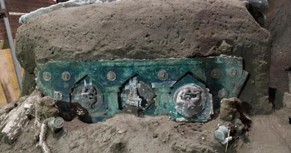 Elegante e leggero, stupefacente per la complessità e la raffinatezza dei decori in stagno e bronzo, incredibile nella sua completezza, con le tracce dei cuscini, delle funi per reggere le corone di fiori, persino le impronte di due spighe di grano lasciate su un sedile. A Pompei, gli scavi della villa di Civita Giuliana non finiscono di stupire e restituiscono uno straordinario carro da parata, dipinto di rosso e rivestito da decorazioni a tema erotico, destinato forse al culto di Cerere e Venere o più probabilmente ad un'aristocratica cerimonia di nozze.