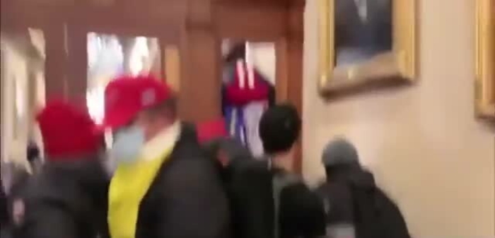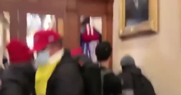 L'obiettivo inquadra una porta chiusa con il vetro spaccato, bloccata da sedie usate come barricata per impedire ai rivoltosi di avanzare lungo il corridoio. Sulla sinistra, quasi nascosta dietro un angolo, si intravede una persona che impugna una pistola, puntata ad altezza uomo, contro il gruppo di manifestanti dall'altra parte della porta che cerca di forzare il passaggio. Non si vede il suo volto, ha una mascherina nera che lo copre, ma non sembra indossare una divisa da poliziotto, si nota il polsino della camicia con i gemelli.