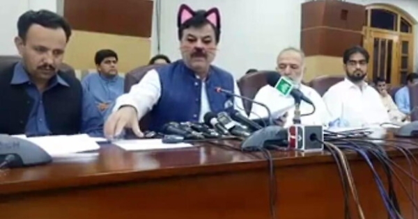 Una conferenza stampa in diretta streaming su Facebook in Pakistan si è trasformata in una cat-astrofe per il ministro regionale pakistano Shaukat Yousafzai. Qualcuno ha dimenticato "inserito" il filtro che mette delle orecchie di gatto rosa sulla testa dei soggetti in video e la frittata è stata fatta.