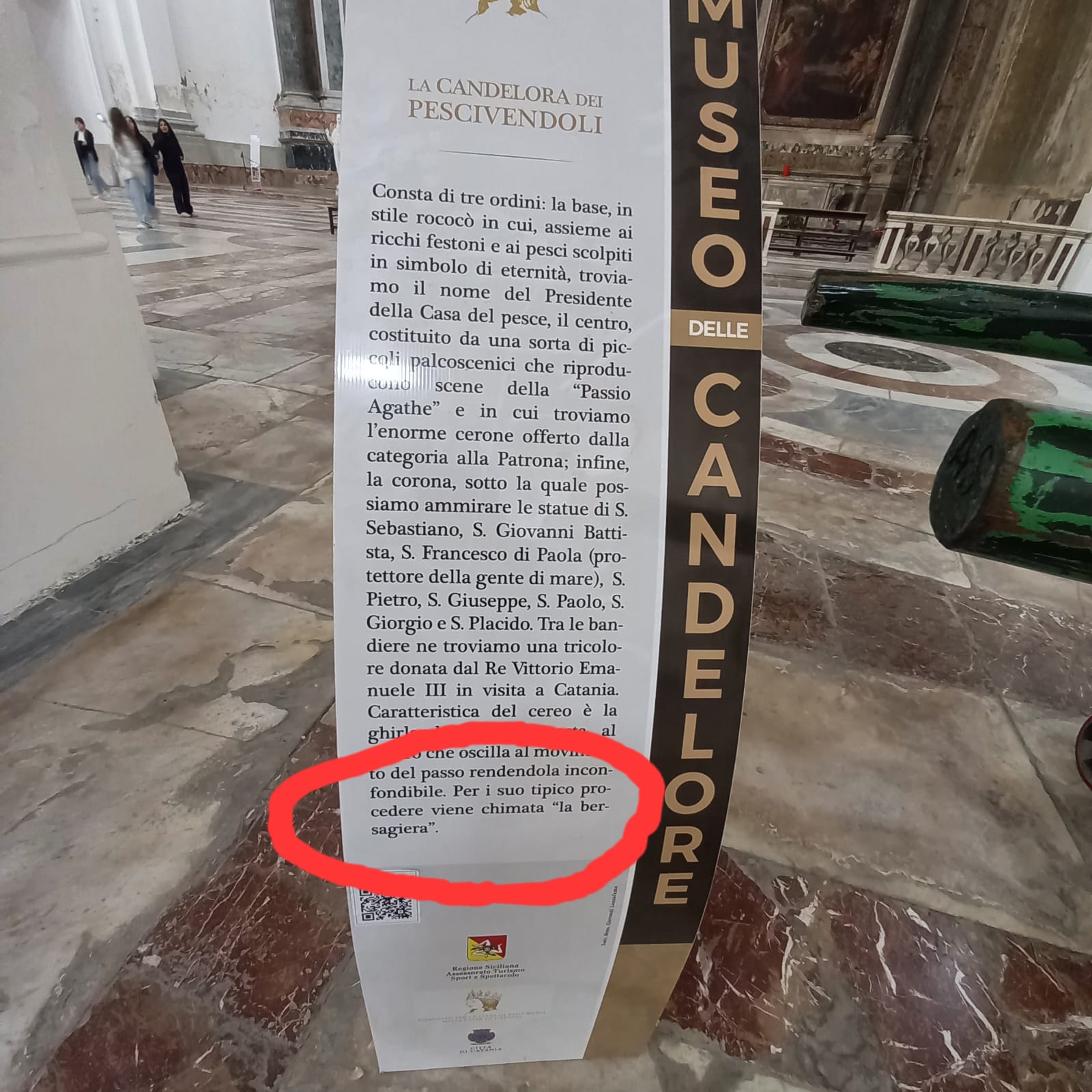 Desidero segnalare la presenza di macroscopici errori sulla descrizione di alcune candelore all'interno della chiesa di San Nicolò l'Arena. Tali descrizioni - che riportano il logo della Regione Siciliana, della città di Catania e che hanno superato chissà quanti controlli - sporcano i vanti storici, artistici e culturali della chiesa più grande della Sicilia che ospita anche un sacrario, una meridiana di Sartorius e Peters, un pregevole organo, acquasantiere monumentali, importanti tele ospitate nelle dodici cappelle etc. Ritengo che la presenza del codice QR releghi la vergogna solo agli italiani che leggono, sentimento quadruplicato in una professoressa che accompagna una classe in visita didattica.