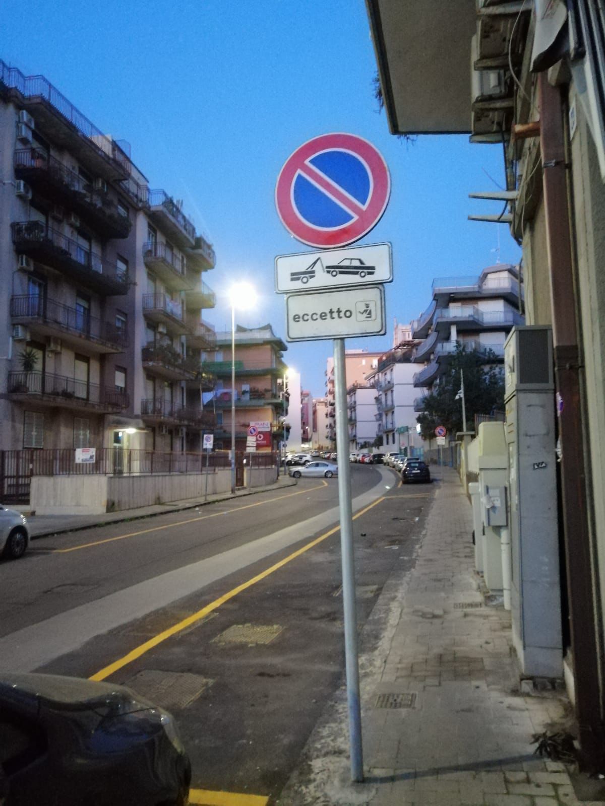 In verità gli unici parcheggi riservati è contraddistinto da stalli di colore giallo erano quelli che insistevano sullo stesso edificio del commissariato e dallo stesso lato, e quelli di fronte l’edificio stesso. Ma da due giorni sono spuntati questi segnali di divietò di sosta che escludono da tale divieto i mezzi di polizia. I residenti non possono più parcheggiare perché gli spazi rimanenti della via risultavano già insufficienti prima di questa sorpresa , figuriamoci adesso