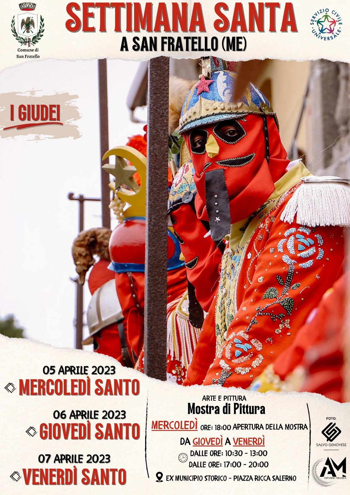 La principale attrazione della settimana Santa a San Fratello è la festa dei "Giudei": suggestivo rito, tra sacro e profano, che inizia mercoledì 5 e si conclude venerdì 7. Centinaia di giovani del paese, vestiti con sgargianti abiti, un singolare elmetto e pennacchi, scorrazzano per tre giorni in gruppi nelle strade del paese, scuotendo catene e suonando tipiche trombe per ricreare l'atmosfera di tumulto che si ebbe durante la condanna di Cristo. Nel tardo pomeriggio del venerdì santo, vengono portate in processione con una caratteristica andatura le “Varette”. Su questo percorso di pietà irrompono all'improvviso, con tutta la loro forza dissacrante, i “Giudei” per far assumere alla manifestazione un aspetto più terrificante. La festa si concluderà a tarda notte quando i "Giudei", scoprendosi il volto, andranno a baciare i piedi di Cristo in segno di perdono