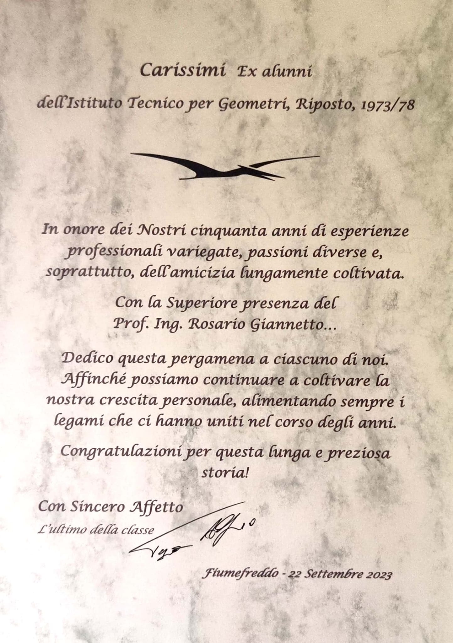 Con professioni che vanno dall’Architetto, all’Ingegnere, al Geometra, all’Imprenditore, all’ex Autista, all’Ex Bancario, alcuni oggi già pensionati. E a far parte di questo emozionante ritrovo c'era anche uno dei loro amati professori, il Prof. Ing. Rosario Giannetto, insegnante di Tecnologia delle Costruzioni Costruzioni, che aveva seguito il loro percorso educativo.