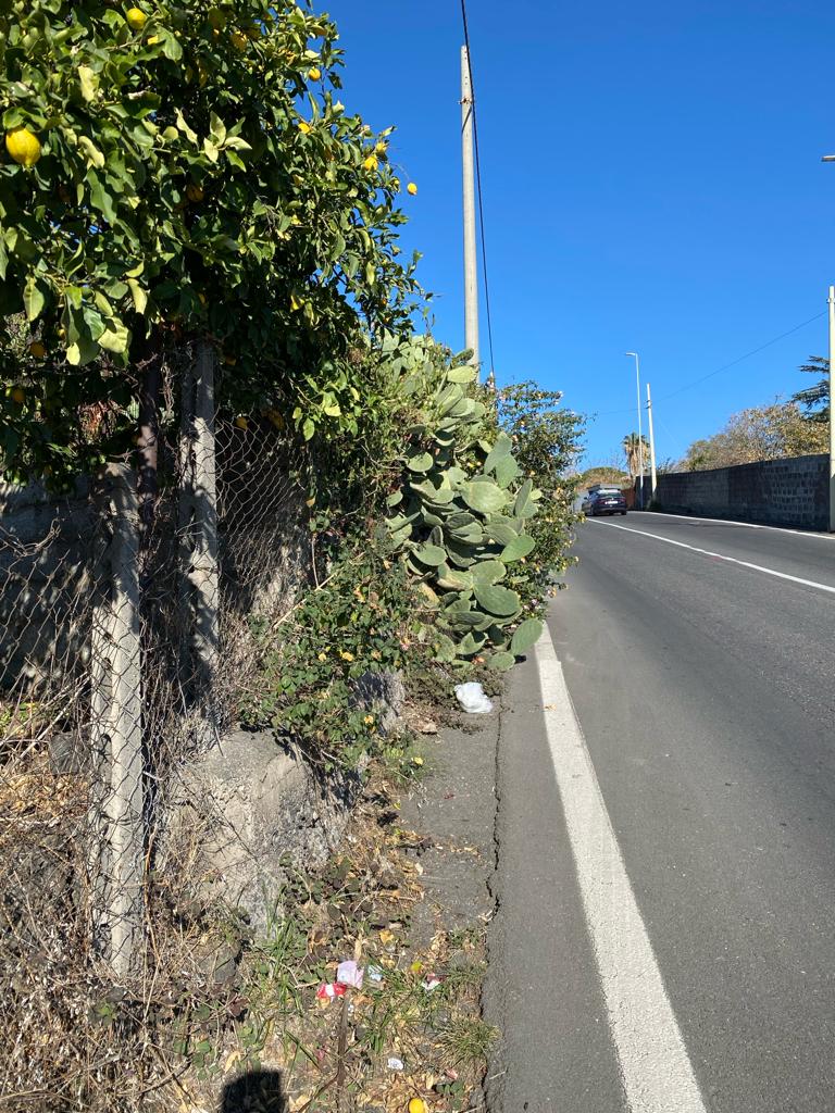 Questa è via Francesco Mannino Cefaly di Catania. Le auto sfrecciano, non c’è marciapiede e, dulcis in fundo, questa siepe di fichidindia ha superato la striscia bianca che delimita la strada. Ci sono dovuto passare è pericolosissima! Quanto meno il Comune dovrebbe imporre al privato di eliminare la siepe che trasborda dal muretto