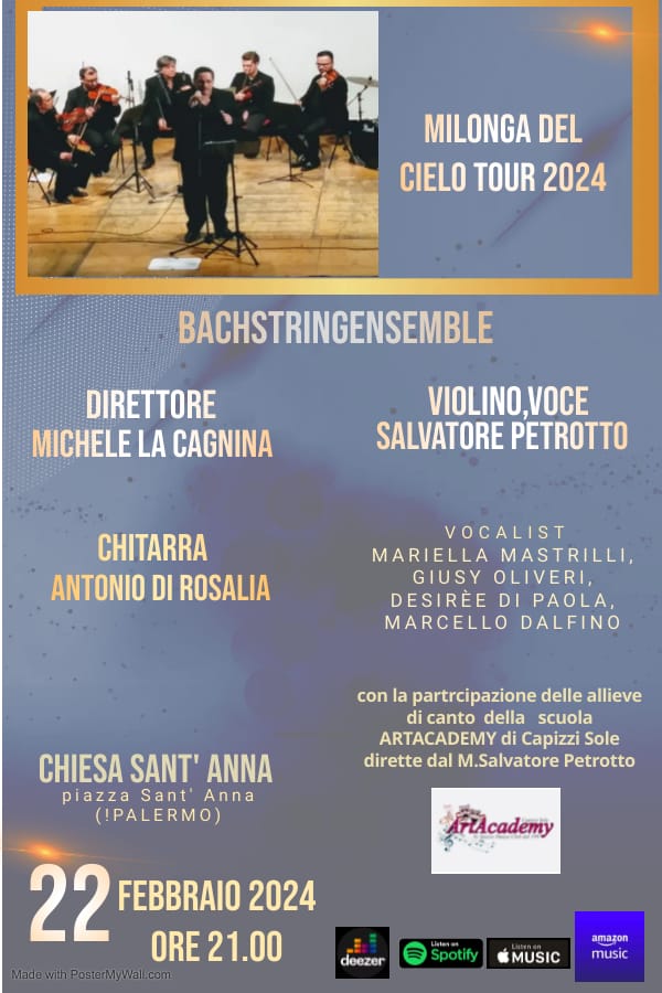 Secondo appuntamento di​ beneficenza presso la Chiesa Sant'Anna​ giorno 22 Febbraio 2024 alle ore 21.00 con il BachString Ensemble diretti dal Maestro Michele La Cagnina, che accompagneranno il Prof. Salvatore Petrotto, violinista e cantante, insieme ai pianisti Giovanni Zappulla​ Simone Greco, al chitarrista Antonio Di Rosalia e ai vocalist Mariella Mastrilli, Giusy Oliveri, Desirèe Di Paola e Marcello Dalfino.