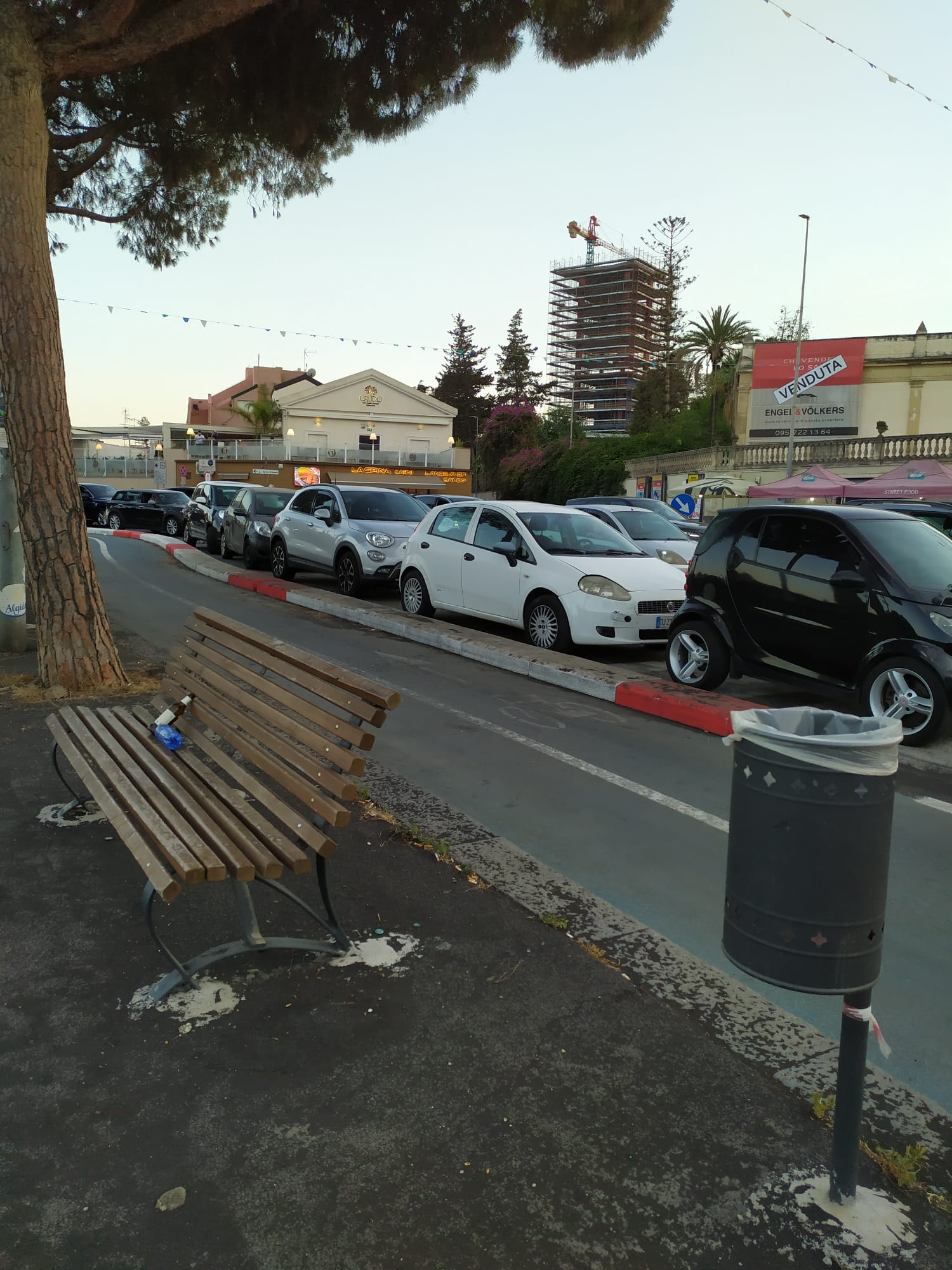 Siamo a Catania in piazza Mancini Battaglia, affacciata sul porticciolo di Ognina. È una panchina su cui sono state abbandonate due bottigliette, una di plastica contenente acqua e l'altra di vetro, che ha contenuto la classica birretta. Cosa ci racconta questa immagine? Proviamo a immaginare una coppietta che vi ha sostato godendo della vista delle tante imbarcazioni da diporto ancorate nella baia, e delle papere e cigni che scivolano tra di esse, su uno specchio d'acqua scintillante di riflessi colori danzanti. Hanno goduto della magia del posto e del momento, forse al tramonto, condividendo sensazioni poetiche e pensieri amorosi. Ma fattasi l'ora di andare che è successo? Lasciano le loro bottigliette sulla panchina vuota.