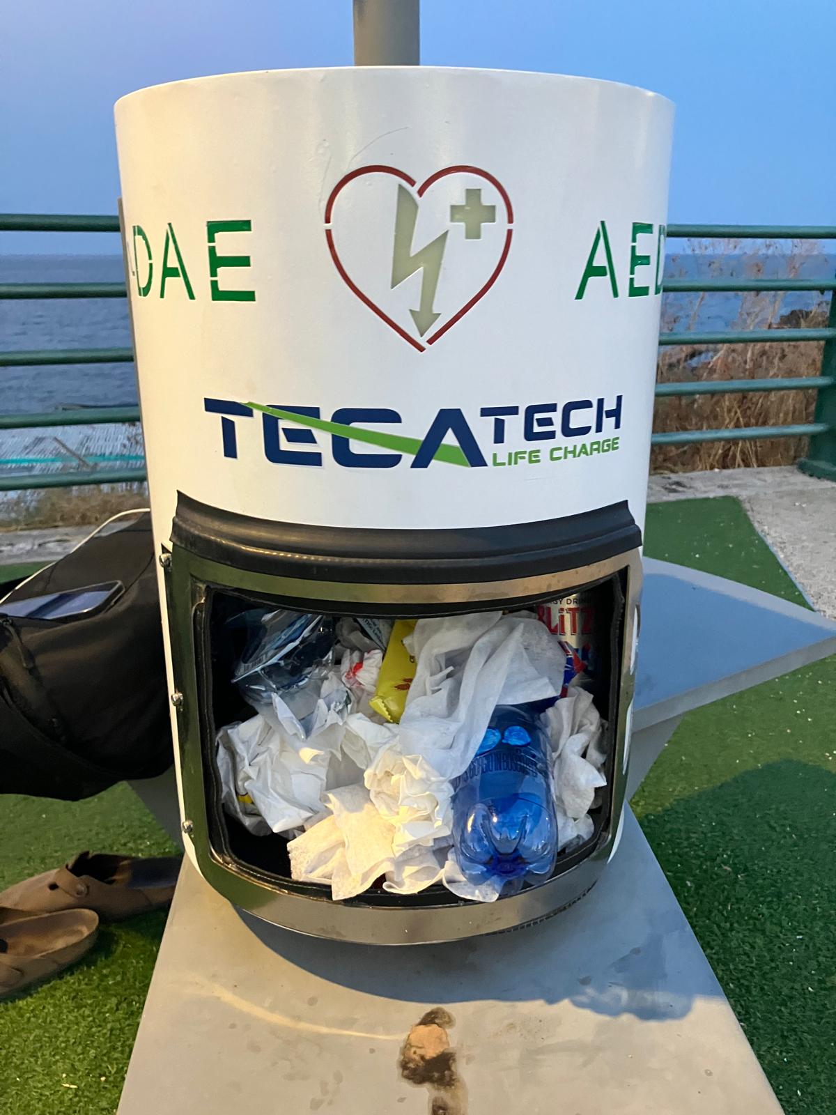 In piazza Europa, nella zona sul mare, nel nuovo parco giochi dei bimbi dove ci sono anche gli attrezzi per l’allenamento dei ragazzi, hanno messo una postazione con defibrillatore. Peccato che sia stata usata come cestino dei rifiuti!