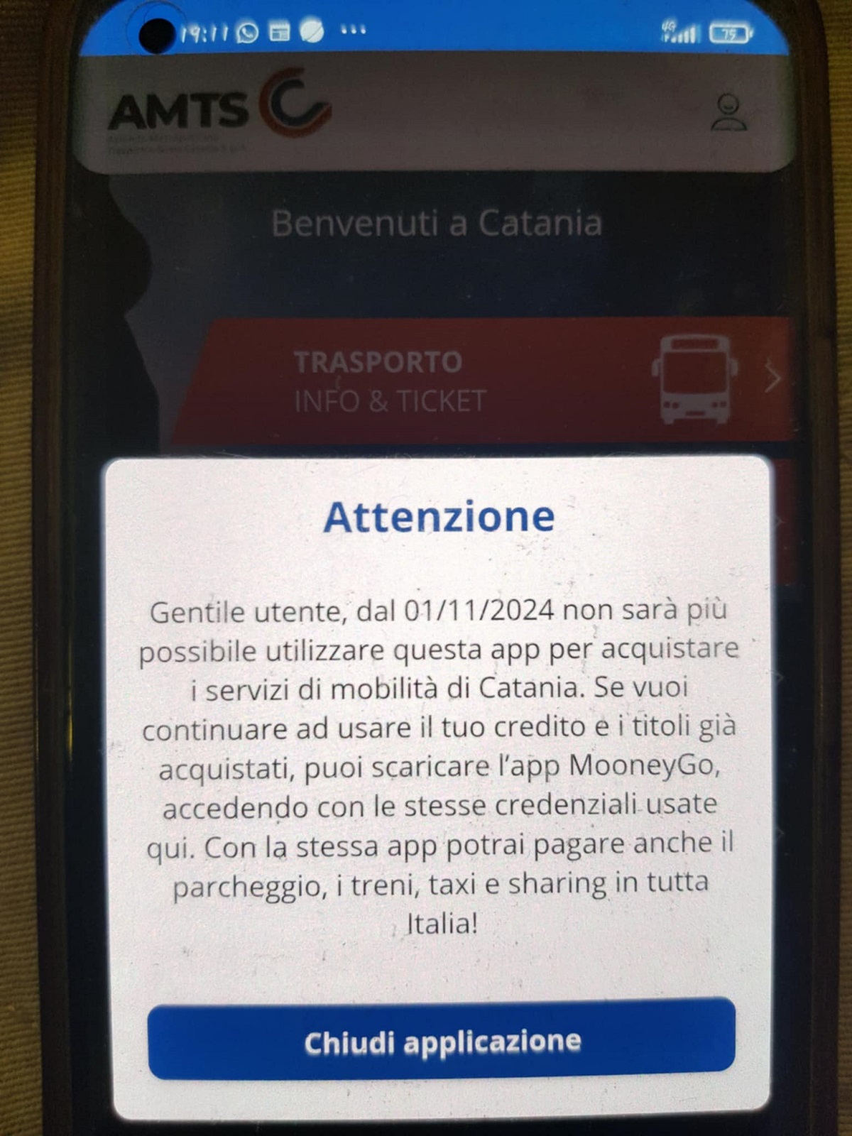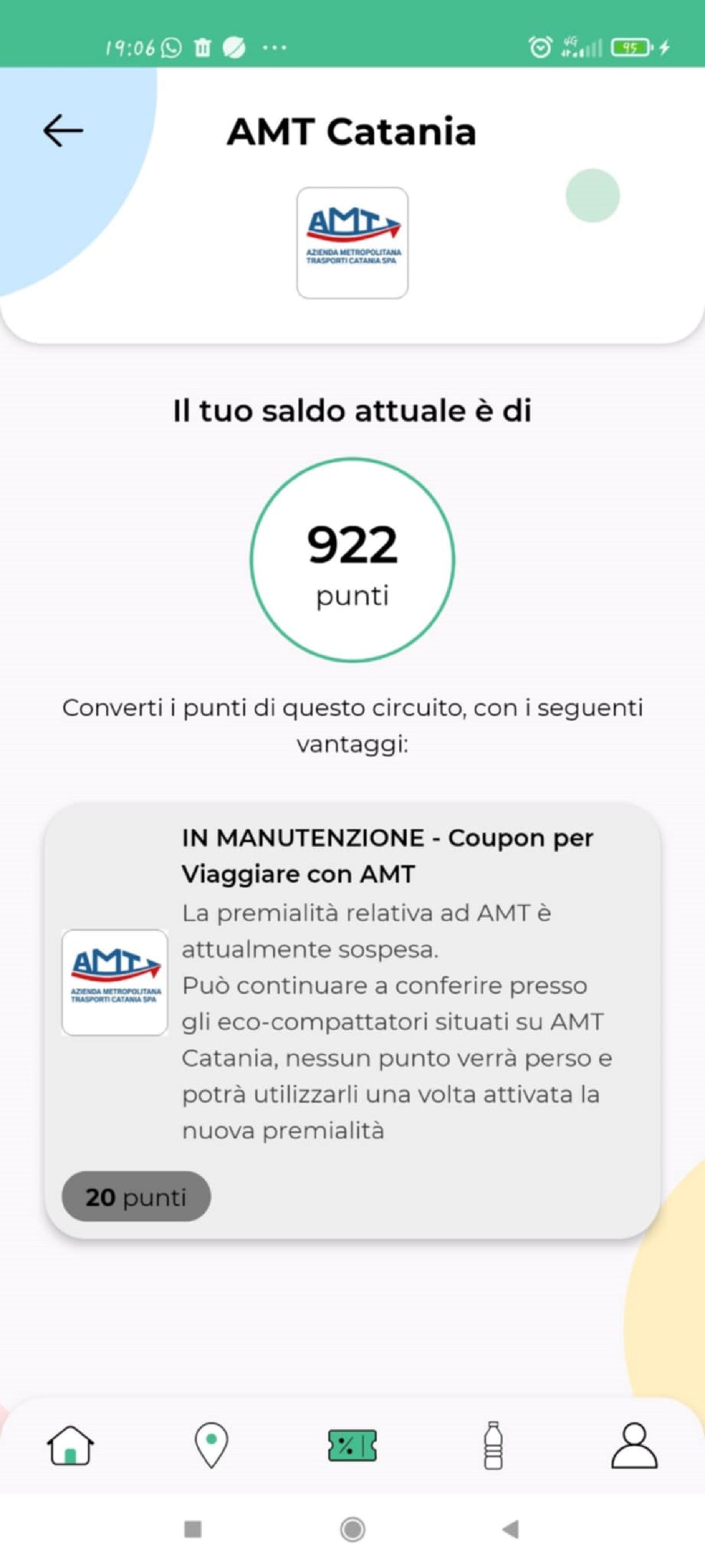 Oltretutto, nemmeno scaricando l'App MooneyGo consigliata da AMTS Catania, si riescono a convertire in titoli di viaggio le bottiglie riciclate (come invece afferma la schermata della vecchia App) ma non ancora trasferite da Coripet a AMTS.