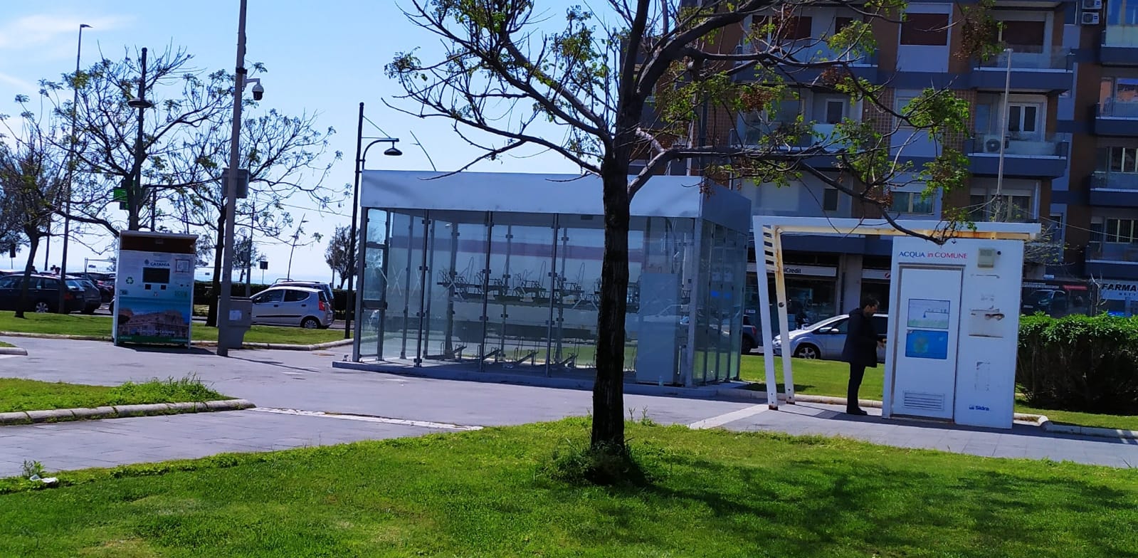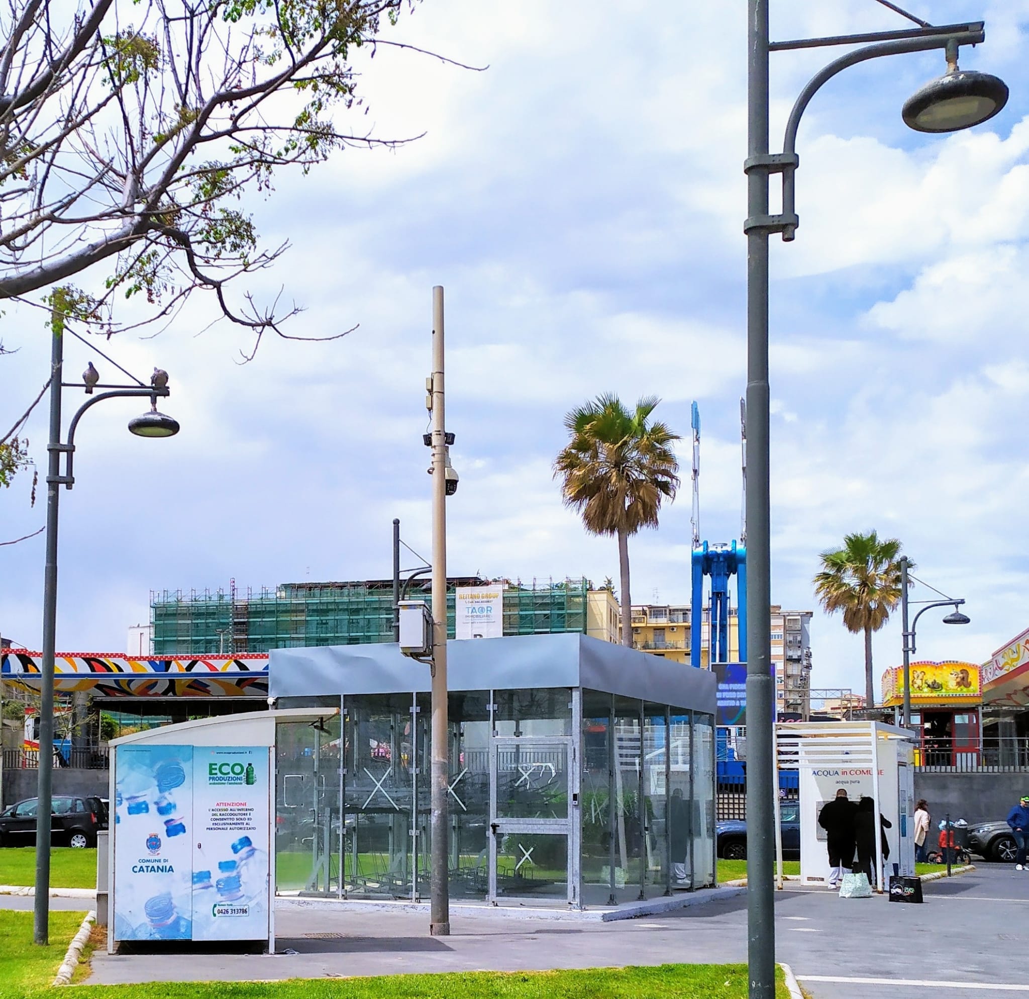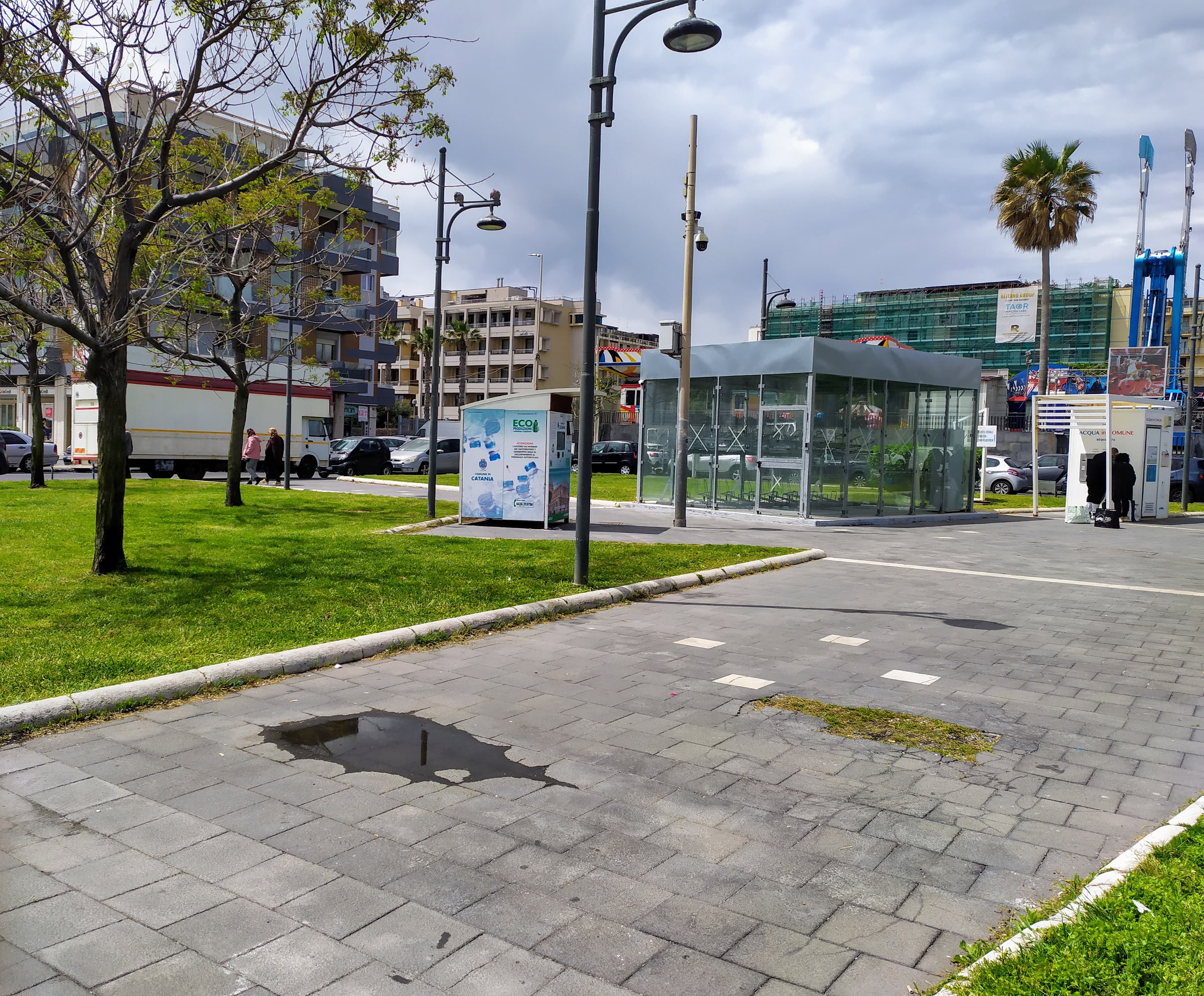 Le installazioni sul lato sud-ovest di Piazza Nettuno, sono talmente brutte e strampalate nella disposizione planimetrica da risultare, anche per chi non si intende di design e progettazione architettonica, un pugno nello stomaco. Tre box di nessuna qualità estetica, morfologicamente contrastanti, disposti alla rinfusa senza alcuna attenzione e intenzione compositiva, deturpano questa frequentata piazza del lungomare catanese. Dei tre manufatti il contenitore più grande, vetrato a struttura metallica, che forse doveva fungere da deposito per biciclette a noleggio, oggi si sta degradando senza essere mai entrato in funzione.