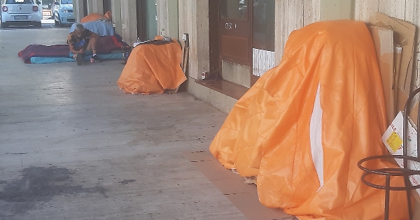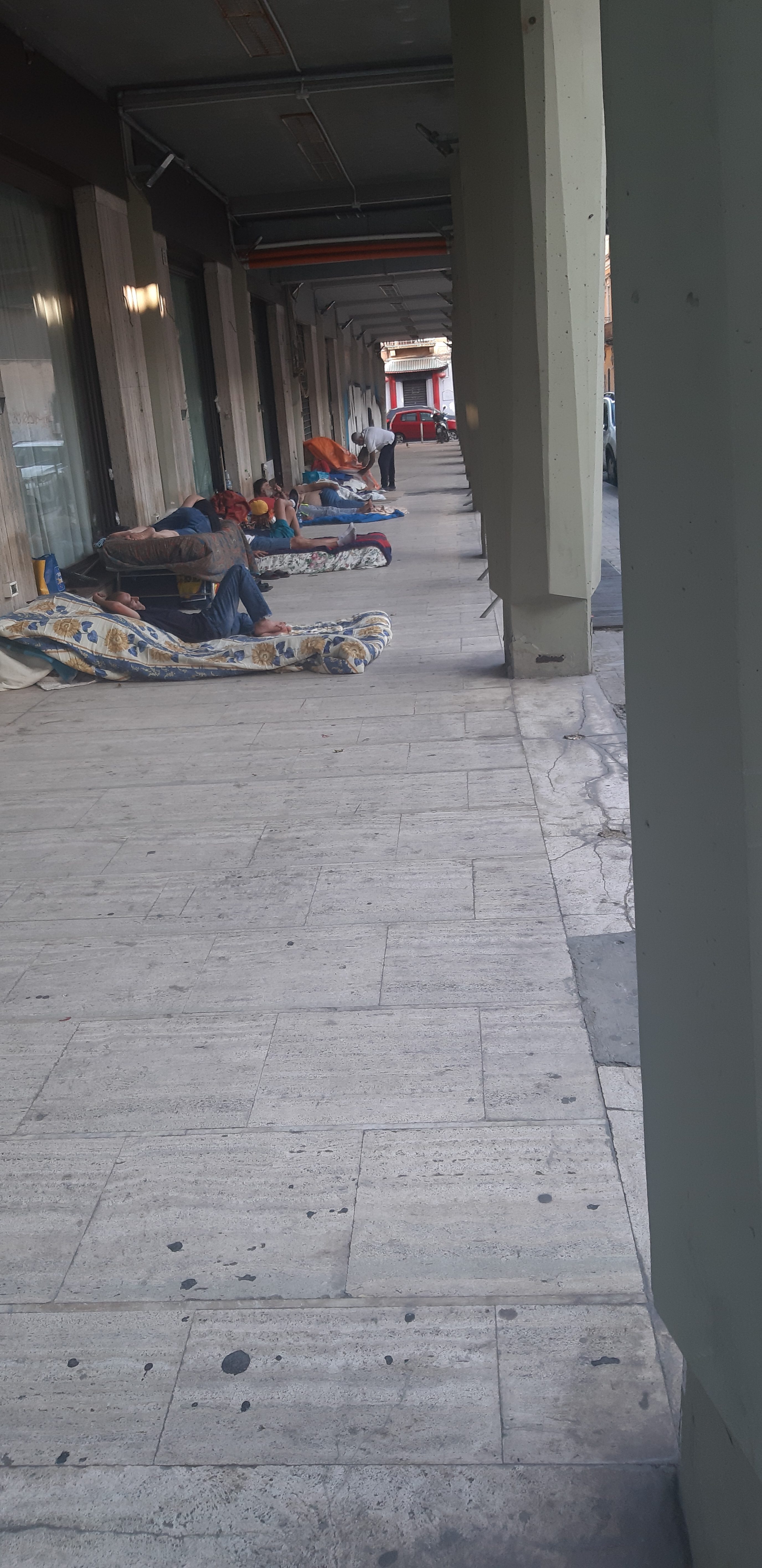 I senzatetto che stazionano sotto i portici di Via Pietro Toselli angolo Via Aloi. Queste vie sono a ridosso di Viale XX settembre di Catania, ossia in uno dei migliori quartieri di Catania.