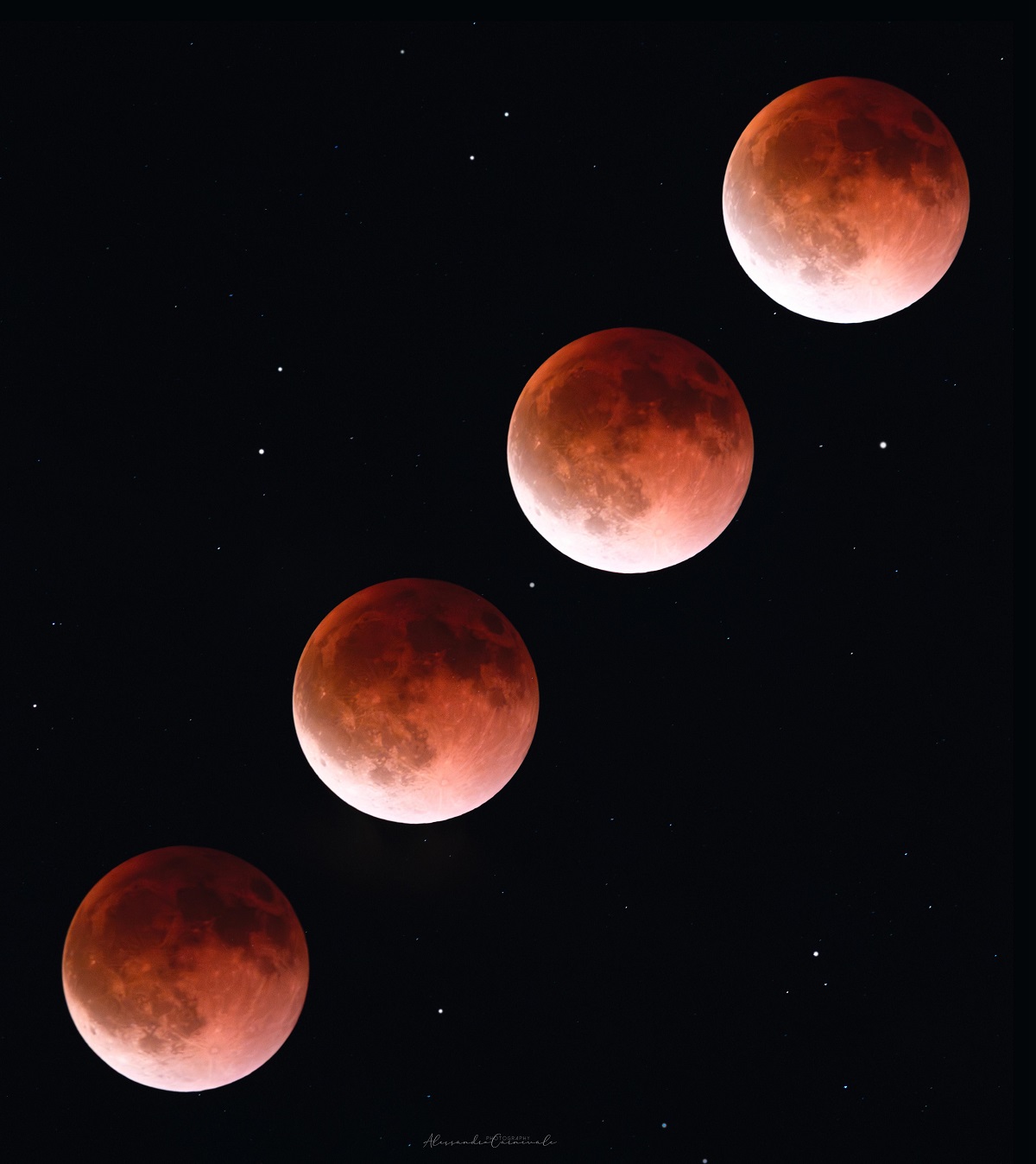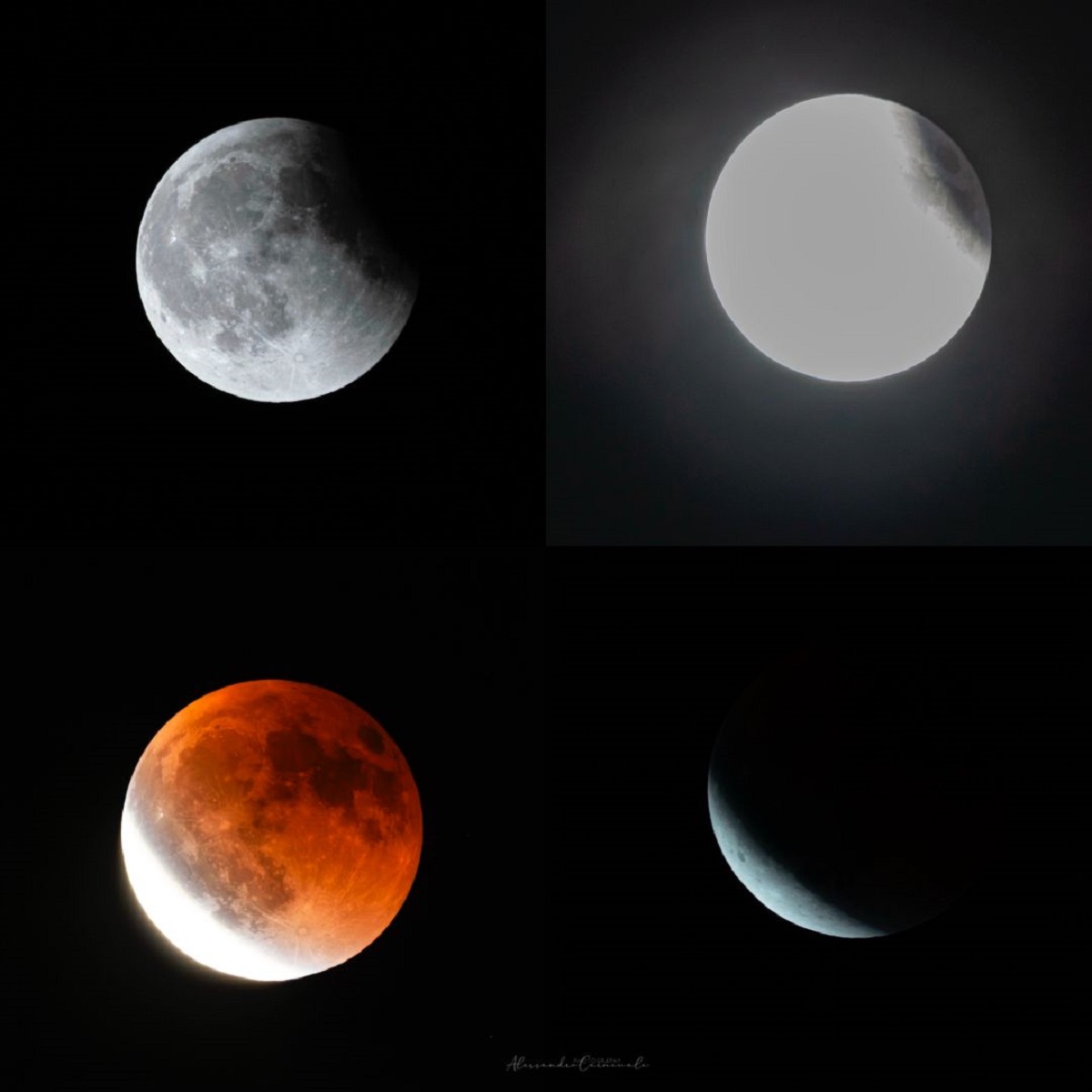 Alessandro Carnevale ha condiviso una sequenza di quattro immagini che mostrano le diverse fasi di un'eclissi lunare totale: dall'ingresso nel cono d'ombra terrestre alla fase parziale, fino alla caratteristica colorazione rossa dovuta alla rifrazione della luce solare attraverso l'atmosfera terrestre, e infine il lento riemergere della Luna alla piena luminosità.