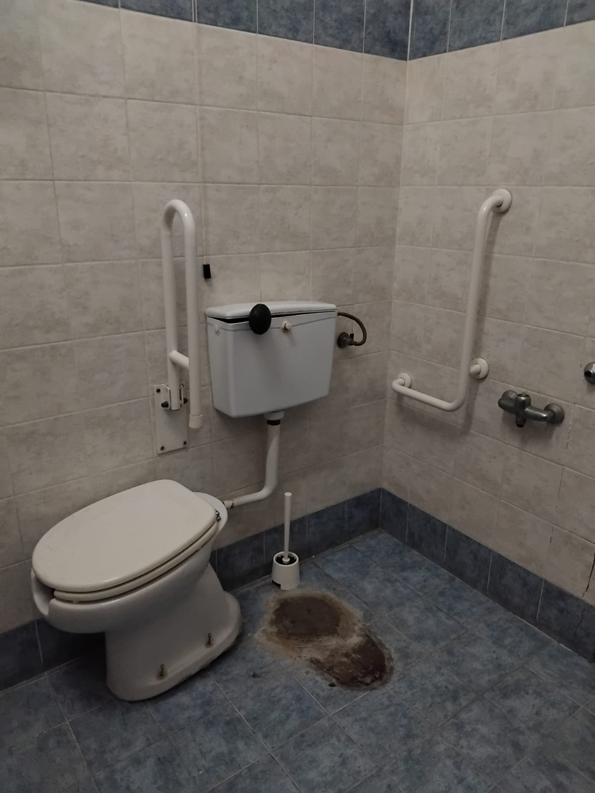 Il mono-wc, a quanto pare, deve aver avuto problemi con lo scarico; tuttavia, invece di provvedere alla riparazione, si è intervenuti tappando lo scarico con del cemento e sbarrando successivamente la porta con una sedia. Una soluzione improvvisata che penalizza soprattutto le persone con difficoltà motorie.