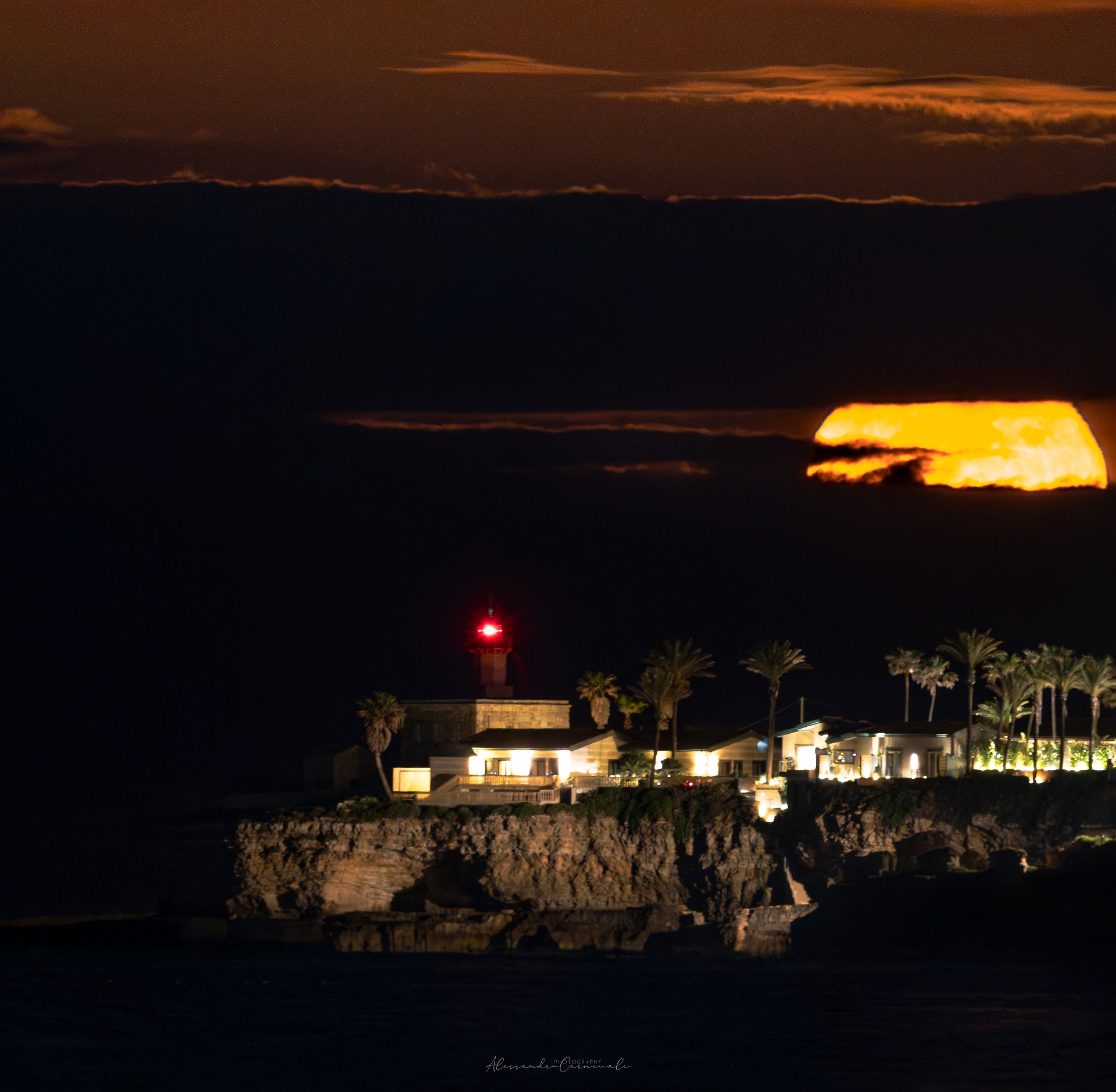 Due scatti della Luna piena nella notte del 3 aprile, sospesa tra nuvole e mare, mentre illumina il promontorio del Faro Massolivieri.