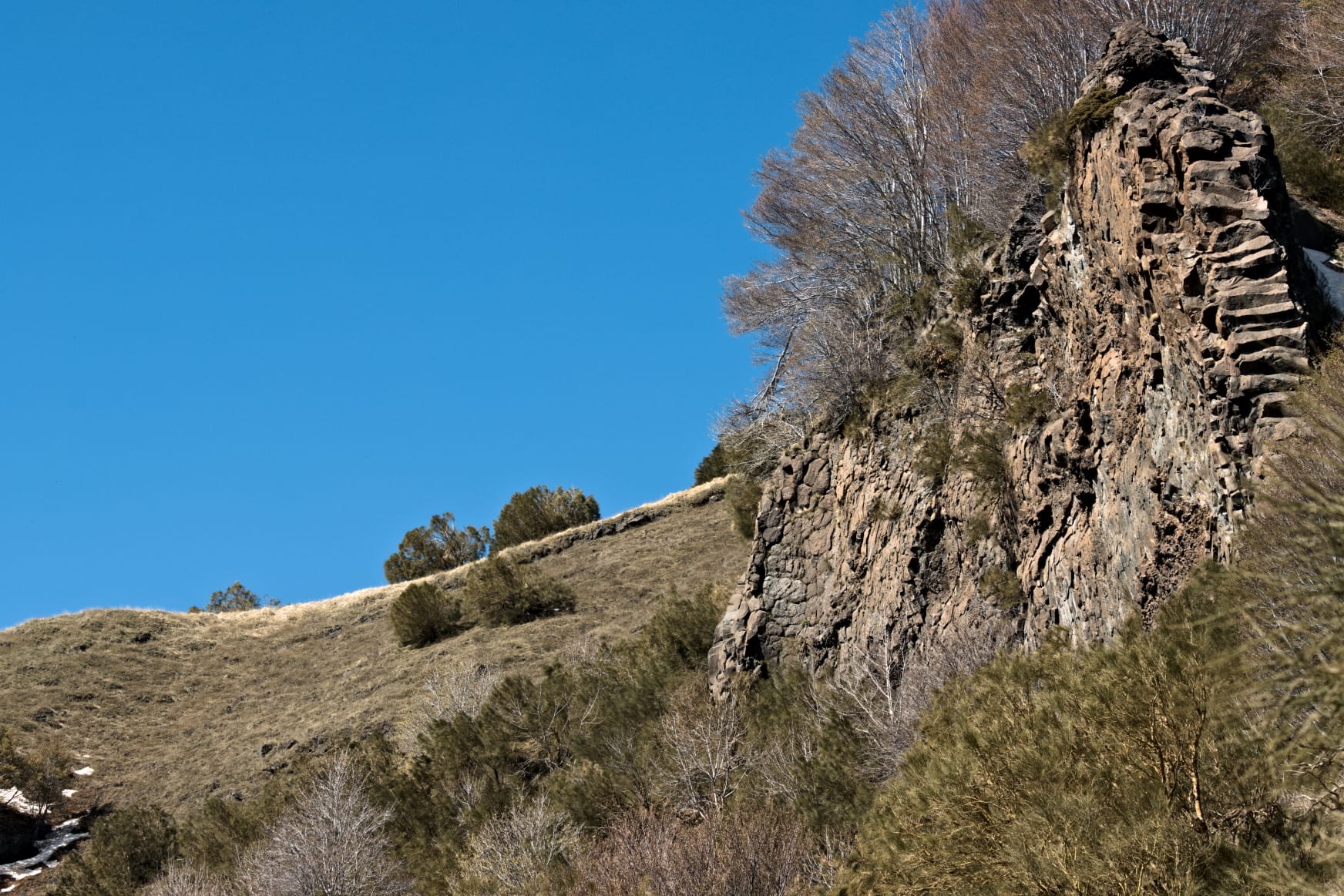 Lungo il tracciato si incontra la sorgente dell’Acqua Rocca, che in alcuni periodi dell’anno dà vita a una piccola ma suggestiva cascata stagionale, incastonata tra le rocce laviche. Proseguendo verso la cresta della Serra del Salifizio, il paesaggio si apre rivelando scorci spettacolari sulla Valle del Bove, una vasta depressione vulcanica che caratterizza il territorio etneo.