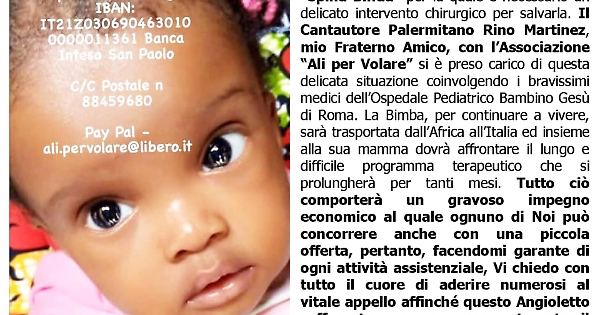 La piccola EMANUELLE ha bisogno dell’aiuto concreto di Tutti Noi per continuare a vivere… Questa creatura, che vive nella foresta Equatoriale Congolese, è affetta dalla grave malformazione denominata “Spina Bifida” per la quale è necessario un delicato intervento chirurgico per salvarla. Il Cantautore Palermitano Rino Martinez, mio Fraterno Amico, con l’Associazione “Ali per Volare” si è preso carico di questa delicata situazione coinvolgendo i bravissimi medici dell’Ospedale Pediatrico Bambino Gesù di Roma. La Bimba, per continuare a vivere, sarà trasportata dall’Africa all’Italia ed insieme alla sua mamma dovrà affrontare il lungo e difficile programma terapeutico che si prolungherà per tanti mesi. Tutto ciò comporterà un gravoso impegno economico al quale ognuno di Noi può concorrere anche con una piccola offerta, pertanto, facendomi garante di ogni attività assistenziale, Vi chiedo con tutto il cuore di aderire numerosi al vitale appello affinché questo Angioletto sofferente possa essere operata entro il mese di marzo 2021.