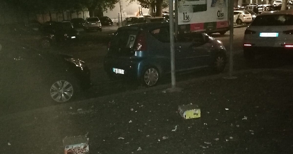 Incoscienti sparano 3 batterie di fuochi d'artificio a pochissima distanza da un gruppo di grandi alberi, con il pericolo di innescare un incendio propagabile alle sottostanti auto! Senza parole. Piazza Lanza, Catania