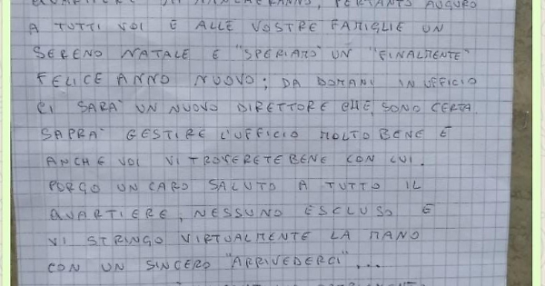 Mi sembra carino segnalare ciò che credo non sia mai accaduto, la direttrice dell'ufficio postale dello Zen ha affisso oggi questo biglietto fuori dall'ufficio, per salutare il quartiere. Credo meriti visibilità come segno di grande civiltà e umanità, oggi difficile da trovare in giro. Mi trovavo di passaggio per prelevare e sono rimasta piacevolmente colpita. Ufficio Postale di via Gino Zappa allo Zen. Agenzia Palermo 41