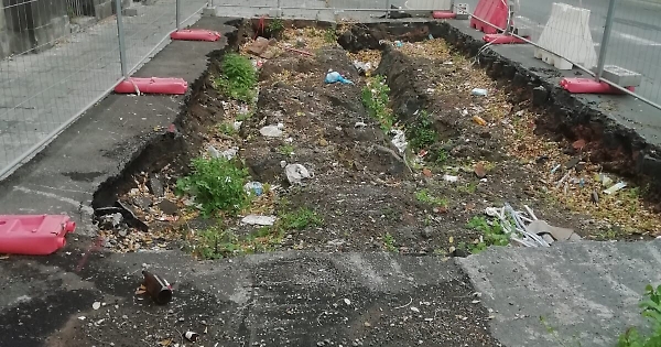 Vi segnalo dalla foto, un potenziale pericolo, per la processione di Sant'Agata che passerà a breve. Questo scavo/cantiere aperto per la metro, e dopo recintato con le barriere di recinzione, si trova all'altezza dell'ex pronto soccorso del vecchio ospedale V. Emanuele. Inoltre sta diventando un immondezzaio, non ha segnaletica di sicurezza luminosa per la sera, e giorni fa, di sera, un motociclista ci stava andando a sbattere. Perché non si chiude? Specie in vista della processione di Sant'Agata?