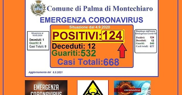 L'Asp agrigentina ha comunicato, al sindaco di Palma di Montechiaro, Stefano Castellino, 18 nuovi positivi e 3 guariti. Due Plessi Scolastici chiusi per sanificazione vista la presenza di positivi.