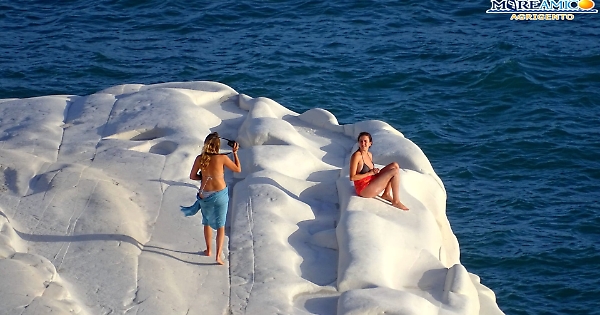 Due ragazze prendono il sole sulla Scala dei Turchi malgrado sia chiusa