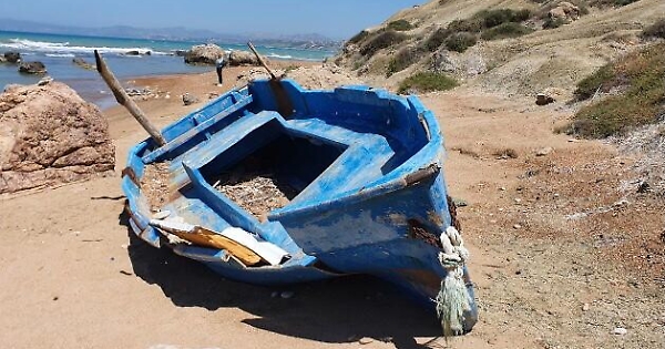 Punta Bianca, arte pittorica su una barca abbandonata in spiaggia