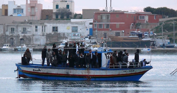 epa02578354 Would-be migrants from Tunisia aboard a boat arrive on the southern Italian island of Lampedusa, Italy, 12 February 2011. Italy declared a humanitarian emergency on its southern islet of Lampedusa on 12 February 2011 and organized air lifts to the mainland as immigrants from Tunisia continued to stream in. Nearly 3,000 people, mostly from the North African country, have made their way to the island in just two days, in the wake of recent political unrest in Tunisia that led to the overthrow of president Zine el- Abidine Ben Ali. EPA/FRANCO LANNINO