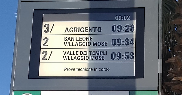 Al via, l'istallazione di 25 pannelli informativi elettronici alimentati a batteria, da istallare alle fermate degli autobus nel territorio di Agrigento. L'utente potrà così conoscere gli orari di passaggio del bus alle fermate in tempo reale mediante un collegamento fisso su rete mobile al sistema centrale di monitoraggio della flotta dell'attuale gestore del trasporto pubblico locale. Un passo in avanti in termini di efficienza sostenuto con i fondi del programma Agenda Urbana, per un importo di 100 mila euro.