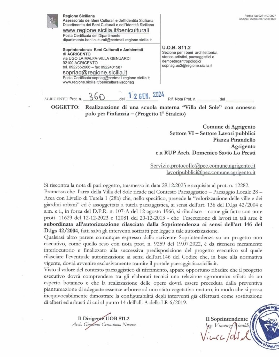Solo che la piantumazione delle “essenze arboree” è stato rinviato – come ha detto l’assessore all’urbanistica Gerlando Principato ad un altro progetto che ancora non è stato finanziato. Questo perché il progetto della villa del Sole è stato "diviso" in due parti e si è deciso di procedere alla prima parte dei lavori ed attendere i fondi per la seconda parte. Così facendo però – a leggere la nota della Soprintendenza di Agrigento - i lavori non possono riprendere se prima non si piantumano le “essenze arboree ad uno stato vegetativo maturo”. Una vicenda che come si sa è oggetto di dibattito pubblico.