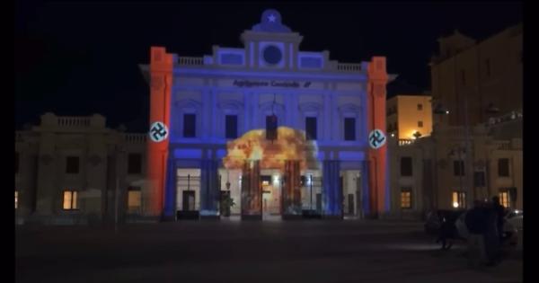 Le svastiche sul video mapping proiettato sulla facciata della Stazione Centrale di Agrigento per raccontare la storia della città che tra un mese e mezzo sarà capitale italiana della cultura.