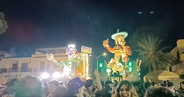 Un pezzo di una delle strutture in cartapesta è finito a terra proprio a ridosso delle persone che erano a piedi ai bordo di uno dei carri allegorici