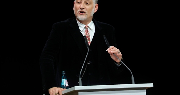 epaselect epa11660764 Italian Minister of Culture Alessandro Giuli speaks during the opening ceremony of the Frankfurt International Book Fair 2024, in Frankfurt, Germany, 15 October 2024. The 76th Frankfurt Book Fair runs from 16 to 20 October 2024. This year's Guest of Honor country is Italy, with the motto 'Roots in the future.' EPA/RONALD WITTEK