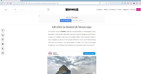 “Il museo en plen air tra i ruderi di Montevago valorizzato sul sito della rivista internazionale di arte contemporanea Wide Walls insieme alle opere dei più noti esponenti della street art. Vedere i murales realizzati dall’artista Ligama tra le macerie del terremoto del ’68 fra i murales di Banksy, il più famoso e importante street artist del mondo, è per noi, che da qualche anno investiamo su questo genere artistico per il decoro urbano e il recupero della memoria, motivo di grande soddisfazione”. Lo dice il sindaco di Montevago margherita La Rocca Ruvolo condividendo su facebook un articolo pubblicato sul sito www.widewalls.ch.