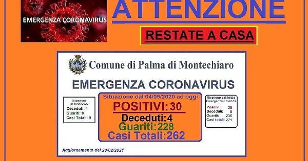 "Continua ad aumentare purtroppo il numero dei positivi - dice il primo cittadino -Dall'ultimo aggiornamento avvenuto il 21 febbraio scorso, abbiamo avuto 10 nuovi positivi. Non mi rimane che invitare, nuovamente, la cittadinanza a tenere alta la guardia, di uscire solo per necessità, di rispettare i divieti, i distanziamenti e di usare i dispositivi di protezione. Si ricorda che sono sempre vietate, malgrado in zona gialla, gli assembramenti, le riunioni, le feste di ogni genere, sia pubbliche che private. Rispettiamo tutti i divieti e le raccomandazioni previsti sia dai DPCM, che dalle Ordinanze del Presidente della Regione Siciliana e del sottoscritto".