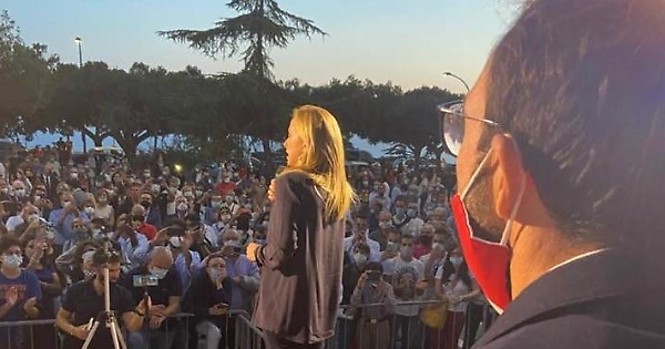 Bagno di folla, nel pomeriggio di oggi, per la leader di Fratelli d'Italia, Giorgia Meloni che è arrivata ad Agrigento per sostenere la candidatura a sindaco di Daniela Catalano. Oltre cinquecento persone, tutte con mascherina, hanno affollato Piazza Cavour per vedere dal vivo il comizio di quella che è la leader più in forte ascesa di questo momento. Giorgia Meloni ha parlato di cambiamento, di rilanciare l'immagine di Agrigento, di porti chiusi, del blocco navale. Tutti argomenti che da tempo i componenti di Fratelli d'Italia trattano nelle più svariate sedi. Al fianco di Giorgia Meloni, l'onorevole Lollobrigida che aveva già presenziato, sempre nella città dei templi, ad una convetion della candidata sindaco Catalano.