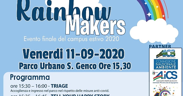Grande attesa a Mussomeli per il Rainbow makers in programma alle 15,30 al Parco urbano Genco. Si chiude il centro estivo che ha visto coinvolti decine e decine di bambini con diversi partner a cominciare dall’Aics provinciale di Agrigento e l’Aics Commissione nazionale Ambiente. L’accoglienza è prevista dalle 15,30 alle 16 nel pieno rispetto delle misure anti covid. Seguirà subito il Tell your happy story con i bambini che racconteranno i loro felici episodi presso l’Happy park. Dalle 16,45 alle 17,45 rifiu-thlon, una caccia al rifiuto: gioco educativo di raccolta delle bottiglie di plastica sparse nel Parco. La consegna dei sacchi con all’interno le stesse bottiglie verranno poi consegnate al sindaco per depositarli nell’isola ecologica. Alle 17,45 creazione di un arcobaleno con palloncini e polveri colorate.