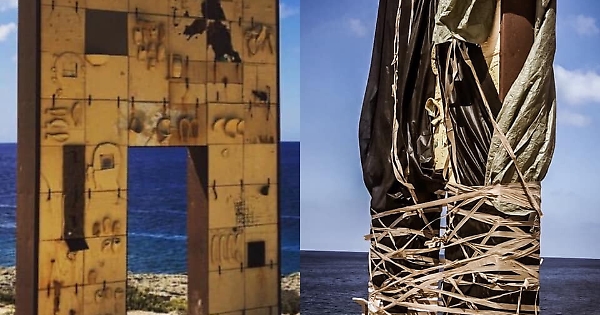 LAMPEDUSA - Qualcuno in nottata ha imballato con sacchi di plastica e nastro adesivo il monumento di Mimmo Paladino, la «Porta d’Europa», inaugurato a Lampedusa il 28 giugno 2008 per celebrare lo spirito d’accoglienza dell’isola, approdo di migliaia di migranti.