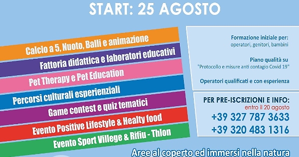Parte a Mussomeli il Campus Estivo “HAPPY PARK Mussomeli Re- Start”. L’inizio del progetto, approvato dal Comune di Mussomeli, è previsto il 25 agosto. Le pre-iscrizioni dovranno giungere agli organizzatori entro il 20 Agosto. Tutte le famiglie beneficiarie del voucher per i centri estivi che erogherà il Comune di Mussomeli avranno diritto a 2 settimane gratuite. Queste le attività previste: Ø Calcio a 5, Nuoto, Balli e Animazione Ø Fattoria didattica e Laboratori educativi, Pet Therapy e Pet Education Percorsi culturali esperienziali, Game contest e quiz tematici, Evento Positive Lifestyle & Healthy food, Evento Sport Village & Rifiu – Thlon. È prevista la formazione iniziale per gli operatori, i genitori e i bambini sul Protocollo e sulle misure anti contagio Covid 19. Tutte le attività saranno svolte sia in aree al coperto e sia immersi nella natura presso l'Agriturismo Monticelli, il Parco Urbano S. Genco e la Palestra Comunale nel pieno rispetto delle norme vigenti e delle misure volte al contenimento della diffusione del contagio da Covid-19. Saranno utilizzati operatori qualificati e una équipe multidisciplinare con esperienza nei vari settori. Sono previsti eventi sul cibo sano, sugli stili di vita positivi e sull’ambiente.