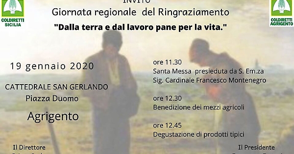 "Dalla terra e dal lavoro pane per la vita." Questa la riflessione per la Giornata regionale del Ringraziamento che si svolgerà domenica 19 gennaio ad Agrigento. La Messa sarà celebrata alle 11.30 dal Cardinale S. E. Francesco Montenegro nella Cattedrale di San Gerlando e al termine, oltre alla benedizione delle macchine agricole sarà offerta una degustazione di prodotti.
