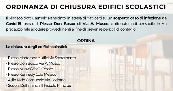 Rimarranno chiusi fino al 20 novembre tutti i plessi scolastici di San Giovanni Gemini. Lo ha deciso, con propria ordinanza, il sindaco Carmelo Panepinto. In una nota diffusa dal comune, il primo cittadino, giustifica la sua decisione al fine di evitare pericoli di contagio tra la popolazione scolastica. Un piccolo studente è risultato contagiato, da qui la decisione del sindaco che ha comunque trovato l'approvazione della maggioranza dei cittadini del centro montano della provincia agrigentina.
