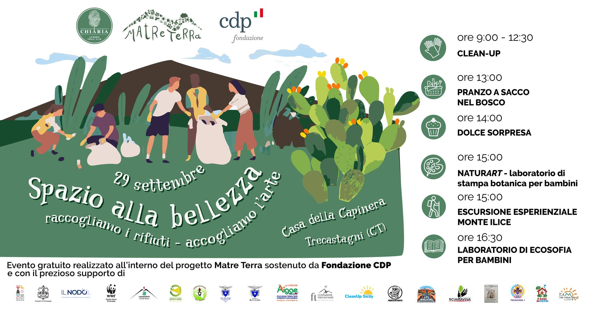 Curiamo il bosco per far posto all’arte. Si chiama, non a caso, "Spazio alla bellezza – raccogliamo i rifiuti – accogliamo l’arte" il grande evento di rimozione dei rifiuti nei boschi intorno alla Casa delle Capinera (Trecastagni – Ct) in programma per domenica 29 settembre nell’ambito del progetto Matre Terra che, promosso da Chiarìa Aps e sostenuto da Fondazione CDP, prevede la realizzazione sull’Etna di un sentiero di land art che ai rifiuti sostituirà opere d’arte dedicate alla sacralità della Natura.