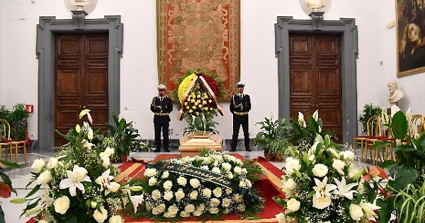 ROMA, 5 LUG - Folla alla Protomoteca in Campidoglio alla camera ardente di Paolo Villaggio. Davanti alla bara, posta su un tappeto rosso, il cuscino di rose bianche della famiglia. "Sarebbe felicissimo dell'addio in Campidoglio e soprattutto della presenza di tutte queste persone, mi diceva sempre che la vera sfortuna è morire durante i mondiali perché non ti si fila nessuno - racconta il figlio Pierfrancesco -. Ho avuto la fortuna di stargli molto vicino negli ultimi 5 anni e questo mi ha dato modo di instaurare un rapporto che non avevo mai avuto prima. Ogni volta che tornavo da un viaggio con lui ero esausto perché era una persona complessa - ricorda ancora -, oggi pagherei per fare uno di quei viaggi. Non sono io a doverlo dire, ma della sua eredità artistica resterà sicuramente la maschera di Fantozzi, con il rispetto dovuto quella interpretazione me lo fa paragonare a Totò".