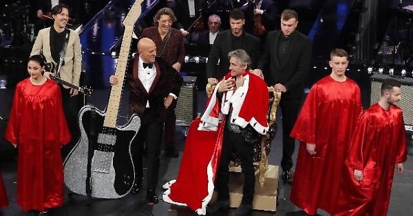 SANREMO, 8 FEB - Il superospite arriva all'Ariston con la superchitarra. Luciano Ligabue porta il suo rock sul palco dell'Ariston. "La seconda volta a Sanremo in 30 anni", dice lui, che viene annunciato da Claudio Bisio in un crescendo. Prima l'ingresso dalle quinte, poi dalla scala, poi dalla scala con una chitarra gigante, infine su un trono con un mantello rosso bordato di ermellino. Gag a parte, prima canta il suo ultimo singolo Luci d'America che anticipa l'album Start, in uscita l'8 marzo, poi la sua hit Urlando contro il cielo. Per l'esibizione con Claudio Baglioni, l'omaggio a Francesco Guccini, con Dio è morto.