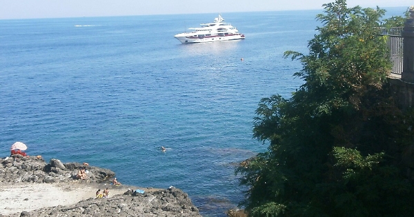 ACI CASTELLO - Sulla cima del castello, le forze comunali si sono messe subito messe in allarme nel vedere quell’enorme barca puntare diritta verso la Praca (la piattaforma lavica che cinge il maniero) ma non hanno imbracciato i fucili né hanno preparato la polvere per i cannoni come i loro antenati, pronti invece a staccare i biglietti per far posto agli ospiti sulla cima del maniero, d’altra parte non ci sono sulla Praca i divieti di salire in Piazza, come avviene in senso inverso. L’arrivo di questo panfilo mastodontico è stato in ogni caso l’attrazione del giorno e tante sonostate le barche che si sono avvicinate a esso che si è piazzato proprio al largo di Bagnaculo, quasi volesse che i suoi occupanti provassero in anticipo il percorso per la caratteristica gara di ferragosto verso le Barracche, dalla parte opposta del Castello.