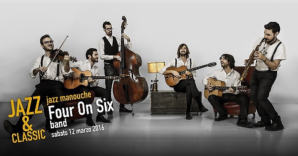 A concludere la rassegna musicale Jazz&Classic, il 12 marzo, saranno i FOUR ON SIX con il loro nuovo live contenente i brani dell'ultimo album presentato in giro per l’Europa. Lo spettacolo ripropone musiche orchestrali come La Traviata di Giuseppe Verdi, un medley di Nino Rota (omaggio ai maggiori successi dei film di Fellini), brani inediti, classici e non della tradizione Swing Italiana (da Ettore Petrolini a Giorgio Gaber, da Paolo Conte a Fred Buscaglione).