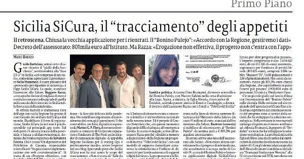 Ma chi l’ha realizzata e dove vengono raccolti i dati dei turisti e degli utenti? Non solo un’app per turisti, in Sicilia da maggio scorso è attivo il progetto Telecovid19. Tramite un’app e device collegati, consente di seguire a distanza gli utenti affetti da Covid che non necessitano di ricovero in ospedale. «Per il progetto, presentato dall’Irccs di Messina e approvato dall’assessorato alla Salute neanche 24 ore dopo, la Regione ha stanziato 800mila euro, ma l’affidamento è avvenuto in modo diretto, senza alcun tipo di bando», dicono da Report.